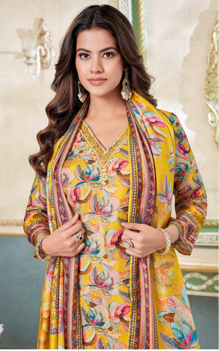 Maslin Silk Floral Printed Salwar Kameez Set with Hand Work