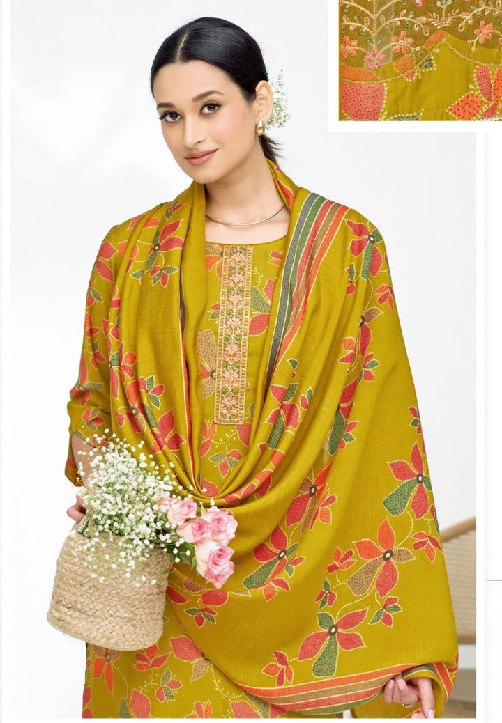 This 3-piece Salwar Kameez Set is crafted from rich Maslin Silk fabric designed to give a luxurious, graceful look for every occasion. The Kameez features beautiful floral print with foil detailing and elegant neck embroidery that adds a refined touch. The cutwork embroidered daman border enhances the sophisticated look. The Bottom is made from plain Maslin Silk in a comfortable straight pants style, while the Dupatta is soft and rich Maslin Silk in a matching printed combination with delicate tassels for a festive finish.