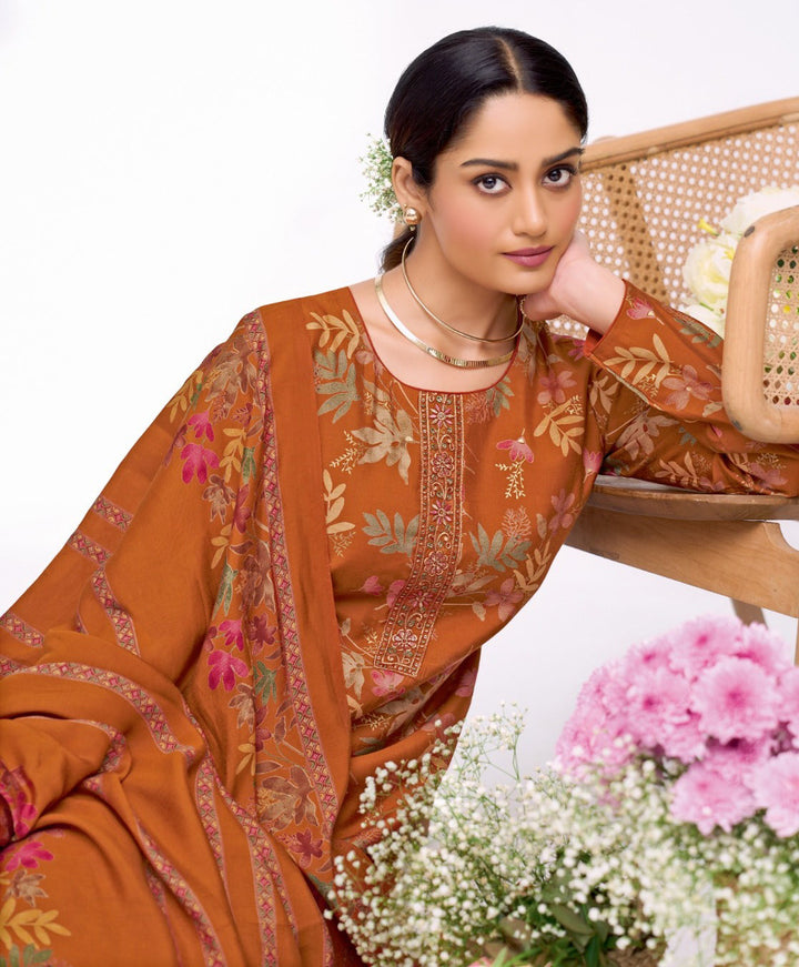 This 3-piece Salwar Kameez Set is crafted from rich Maslin Silk fabric designed to give a luxurious, graceful look for every occasion. The Kameez features beautiful floral print with foil detailing and elegant neck embroidery that adds a refined touch. The cutwork embroidered daman border enhances the sophisticated look. The Bottom is made from plain Maslin Silk in a comfortable straight pants style, while the Dupatta is soft and rich Maslin Silk in a matching printed combination with delicate tassels for a festive finish.