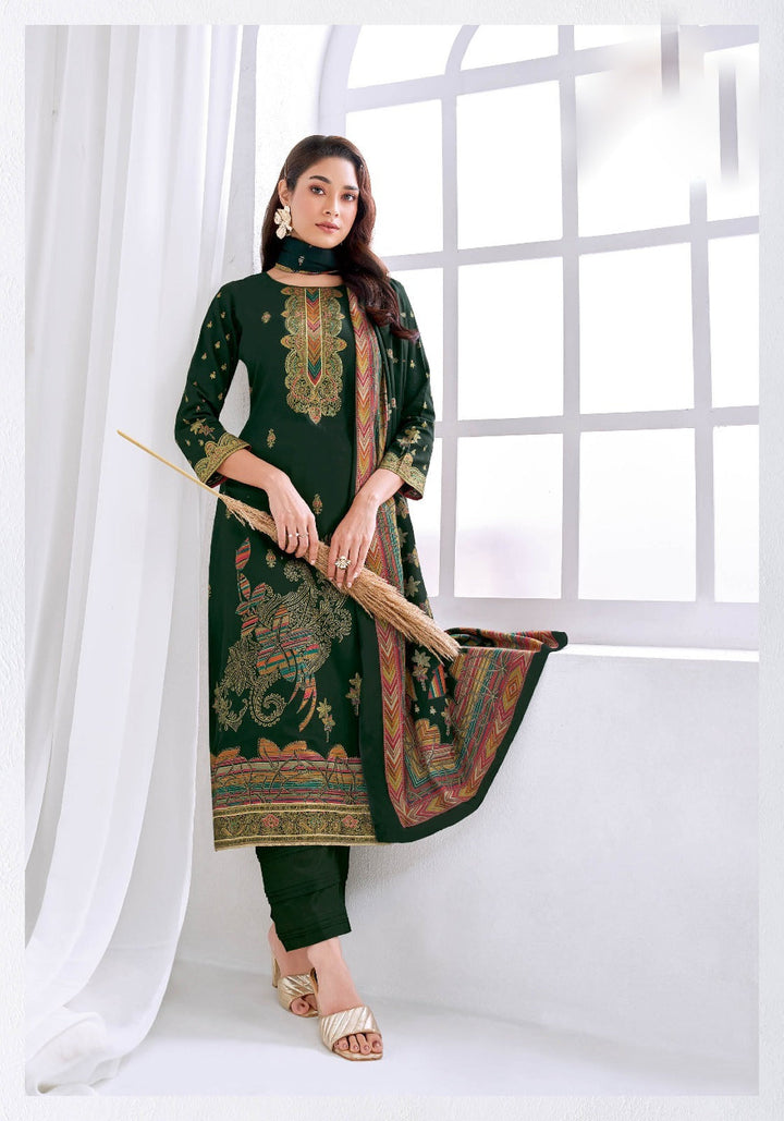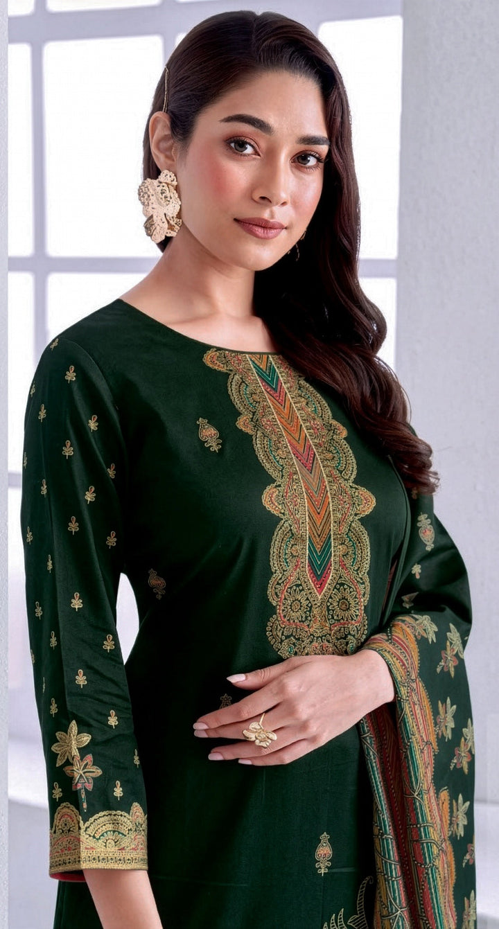 Elevate your ethnic wardrobe with this elegant 3-piece Salwar Kameez Set. The Kameez is crafted from premium jam cotton silk fabric in a plain design, highlighted with gold foil print on the front, enhanced by saroski stone work and a refined daman lace border. Designed without lining for a lightweight, graceful drape.