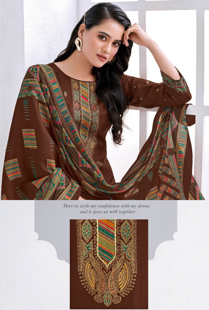 Elevate your ethnic wardrobe with this elegant 3-piece Salwar Kameez Set. The Kameez is crafted from premium jam cotton silk fabric in a plain design, highlighted with gold foil print on the front, enhanced by saroski stone work and a refined daman lace border. Designed without lining for a lightweight, graceful drape.