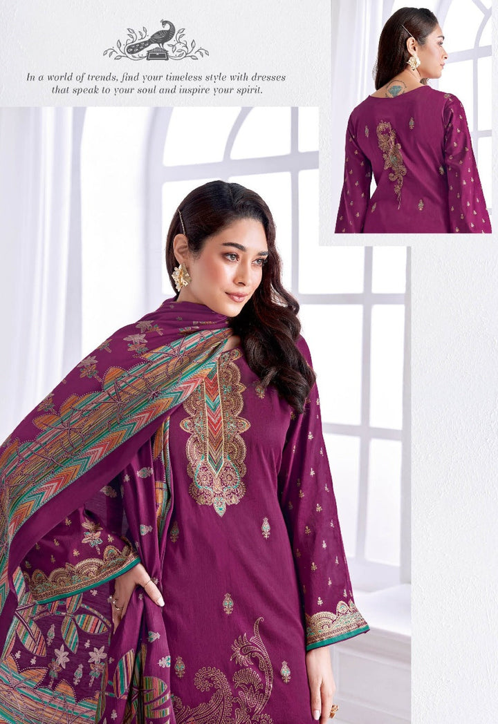 Elevate your ethnic wardrobe with this elegant 3-piece Salwar Kameez Set. The Kameez is crafted from premium jam cotton silk fabric in a plain design, highlighted with gold foil print on the front, enhanced by saroski stone work and a refined daman lace border. Designed without lining for a lightweight, graceful drape.