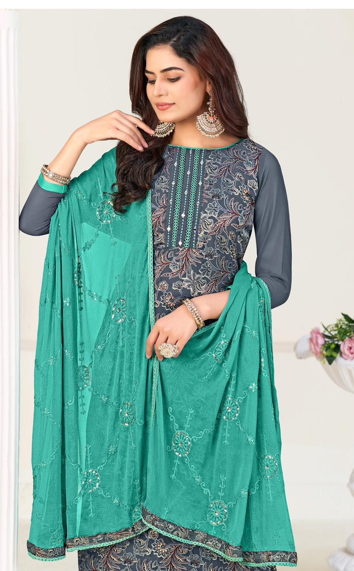 Ladyline Georgette Brasso Salwar Kameez with Mirror Work, Chiffon Embroidered Dupatta & Santoon Silk Pants – Women's 3-Piece Ethnic Set – Festive & Party Wear Dress