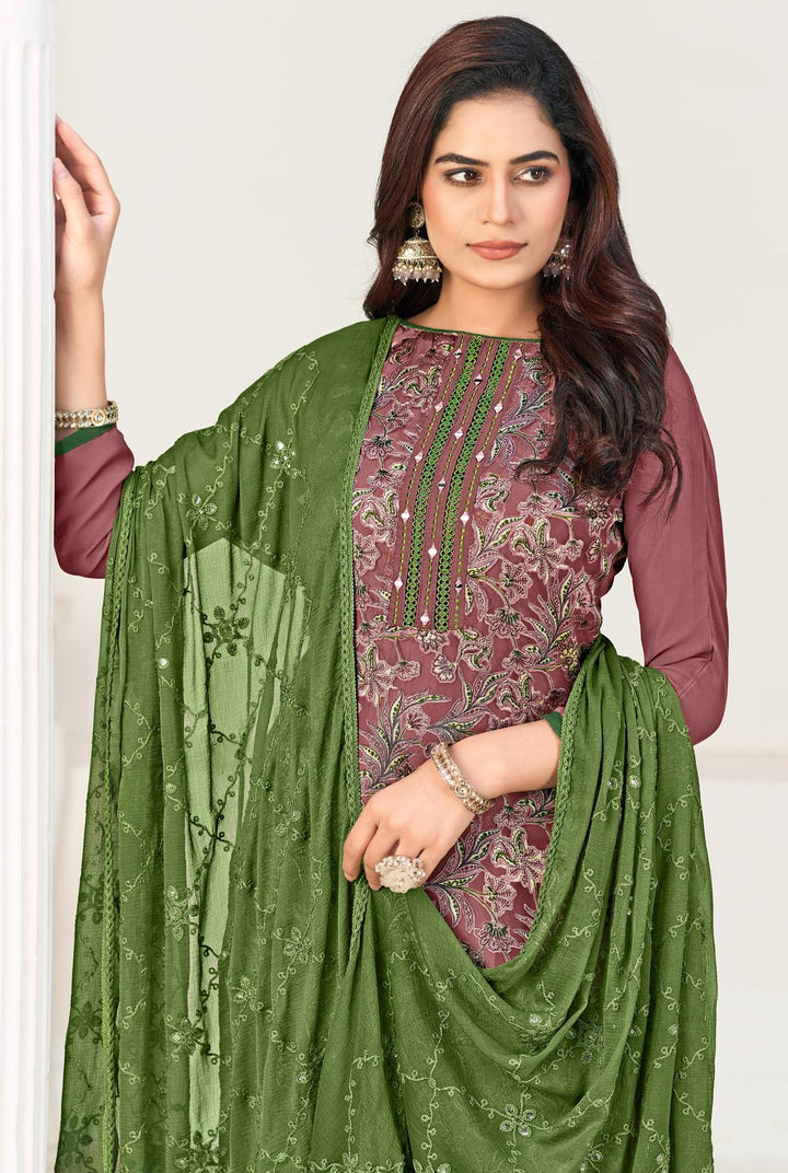 Ladyline Georgette Brasso Salwar Kameez with Mirror Work, Chiffon Embroidered Dupatta & Santoon Silk Pants – Women's 3-Piece Ethnic Set – Festive & Party Wear Dress